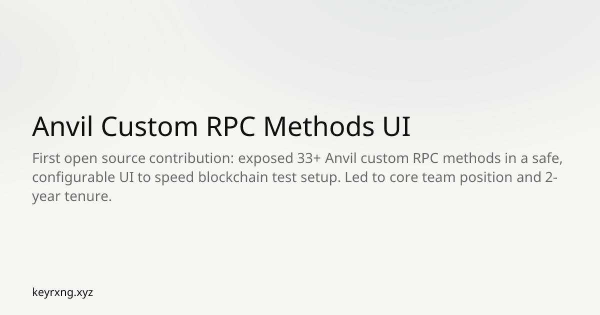 First open source contribution: exposed 33+ Anvil custom RPC methods in a safe, configurable UI to speed blockchain test setup. Led to core team position and 2-year tenure.