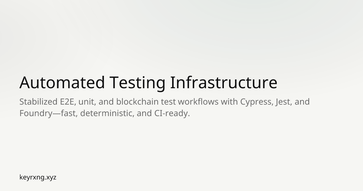 Stabilized E2E, unit, and blockchain test workflows with Cypress, Jest, and Foundry—fast, deterministic, and CI-ready.