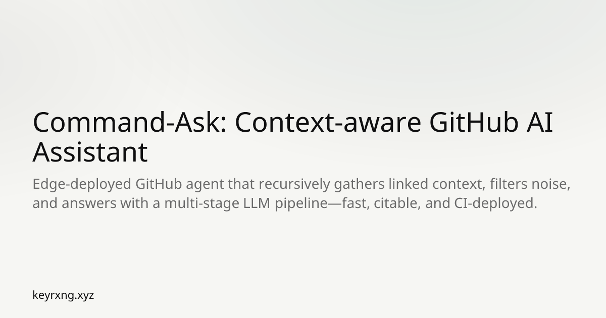 Edge-deployed GitHub agent that recursively gathers linked context, filters noise, and answers with a multi-stage LLM pipeline—fast, citable, and CI-deployed.