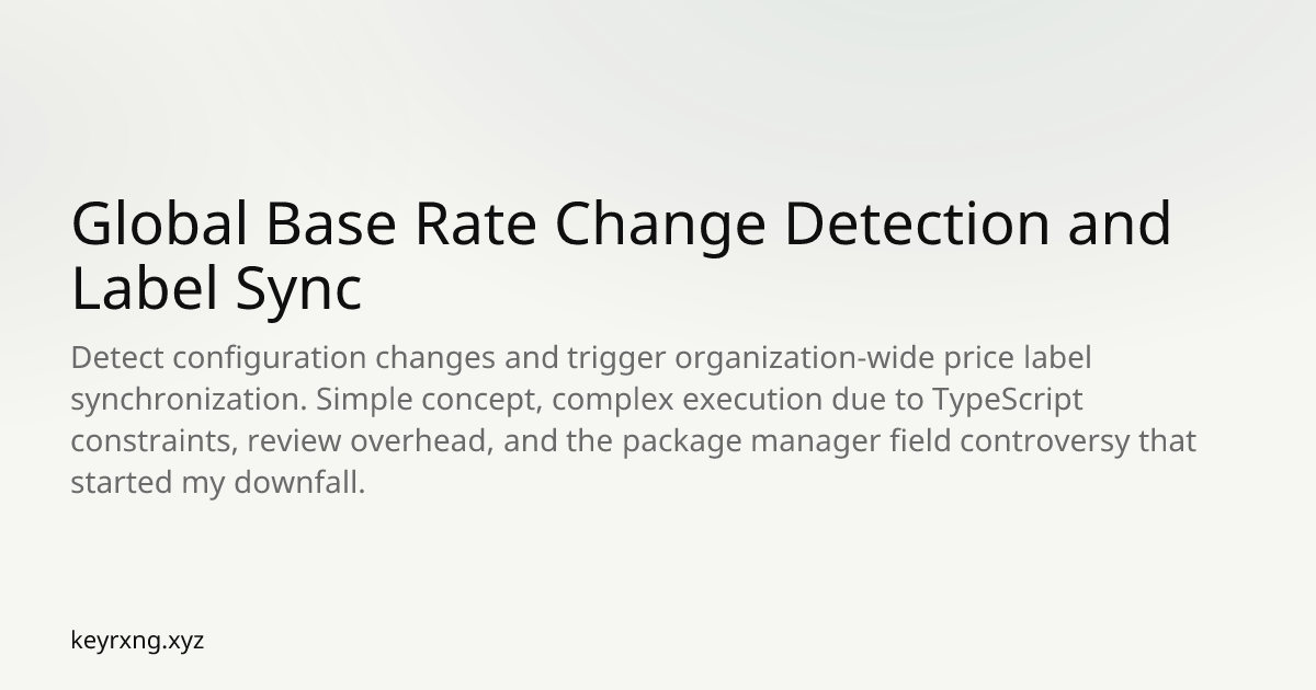 Detect configuration changes and trigger organization-wide price label synchronization. Simple concept, complex execution due to TypeScript constraints, review overhead, and the package manager field controversy that started my downfall.