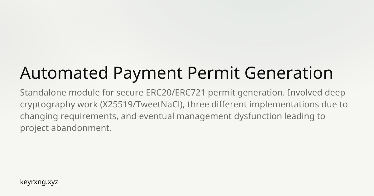 Standalone module for secure ERC20/ERC721 permit generation. Involved deep cryptography work (X25519/TweetNaCl), three different implementations due to changing requirements, and eventual management dysfunction leading to project abandonment.