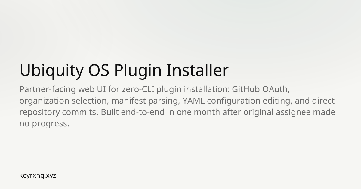 Partner-facing web UI for zero-CLI plugin installation: GitHub OAuth, organization selection, manifest parsing, YAML configuration editing, and direct repository commits. Built end-to-end in one month after original assignee made no progress.