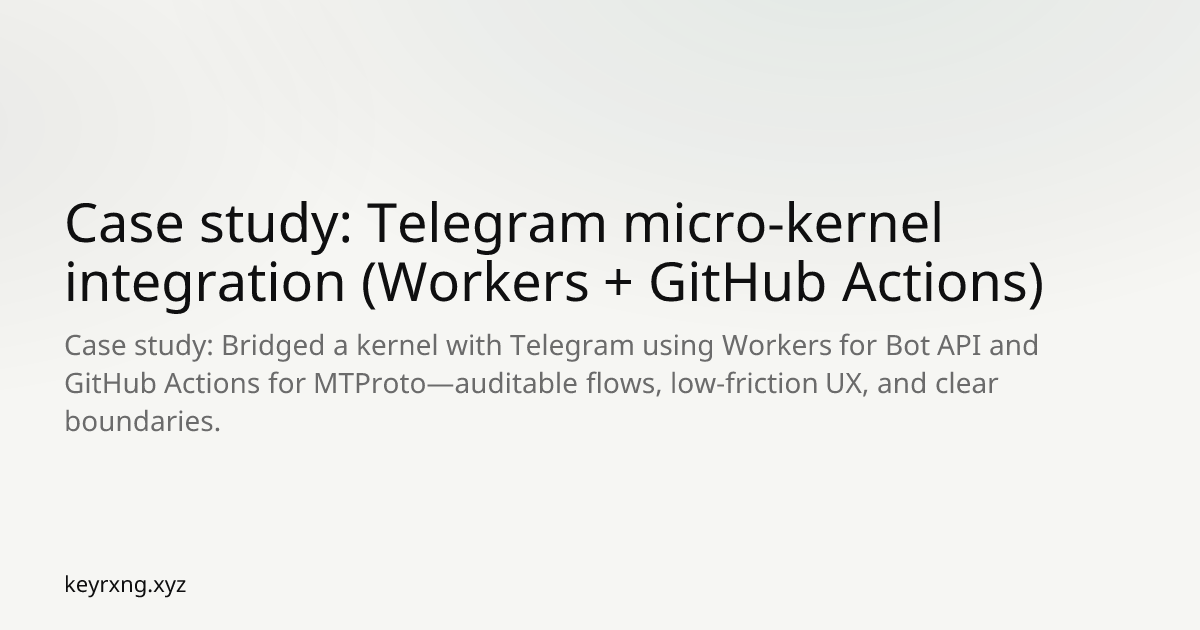 Case study: Bridged a kernel with Telegram using Workers for Bot API and GitHub Actions for MTProto—auditable flows, low-friction UX, and clear boundaries.