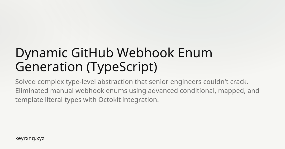 Solved complex type-level abstraction that senior engineers couldn't crack. Eliminated manual webhook enums using advanced conditional, mapped, and template literal types with Octokit integration.