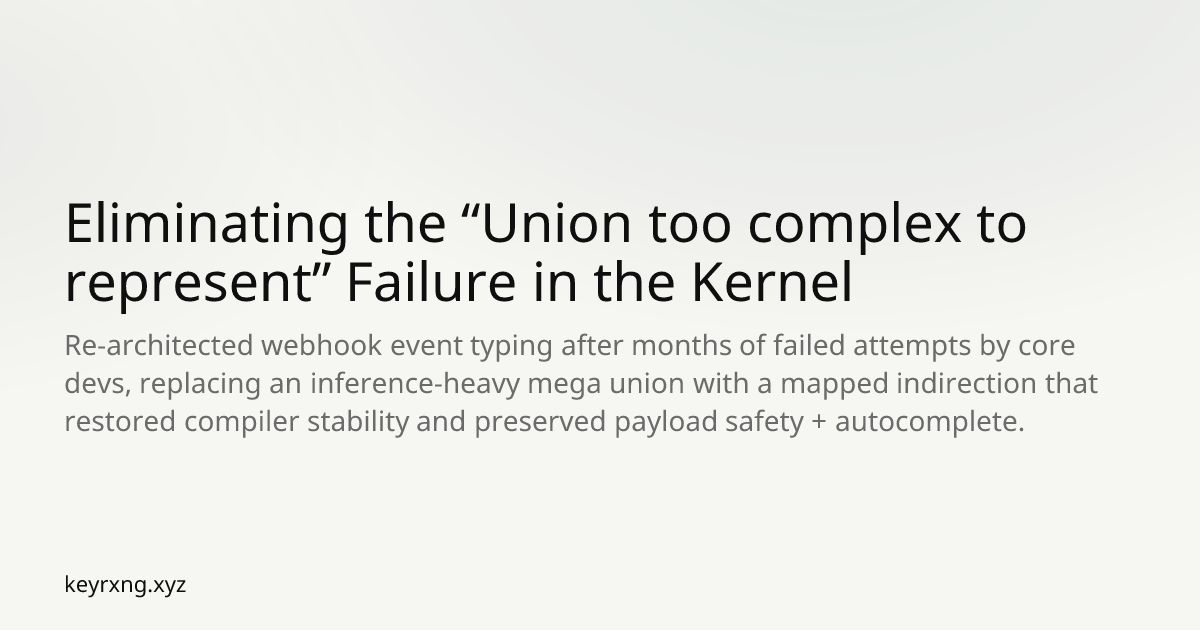 Re-architected webhook event typing after months of failed attempts by core devs, replacing an inference-heavy mega union with a mapped indirection that restored compiler stability and preserved payload safety + autocomplete.