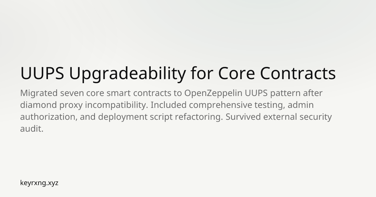 Migrated seven core smart contracts to OpenZeppelin UUPS pattern after diamond proxy incompatibility. Included comprehensive testing, admin authorization, and deployment script refactoring. Survived external security audit.