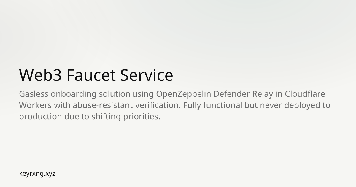 Gasless onboarding solution using OpenZeppelin Defender Relay in Cloudflare Workers with abuse-resistant verification. Fully functional but never deployed to production due to shifting priorities.